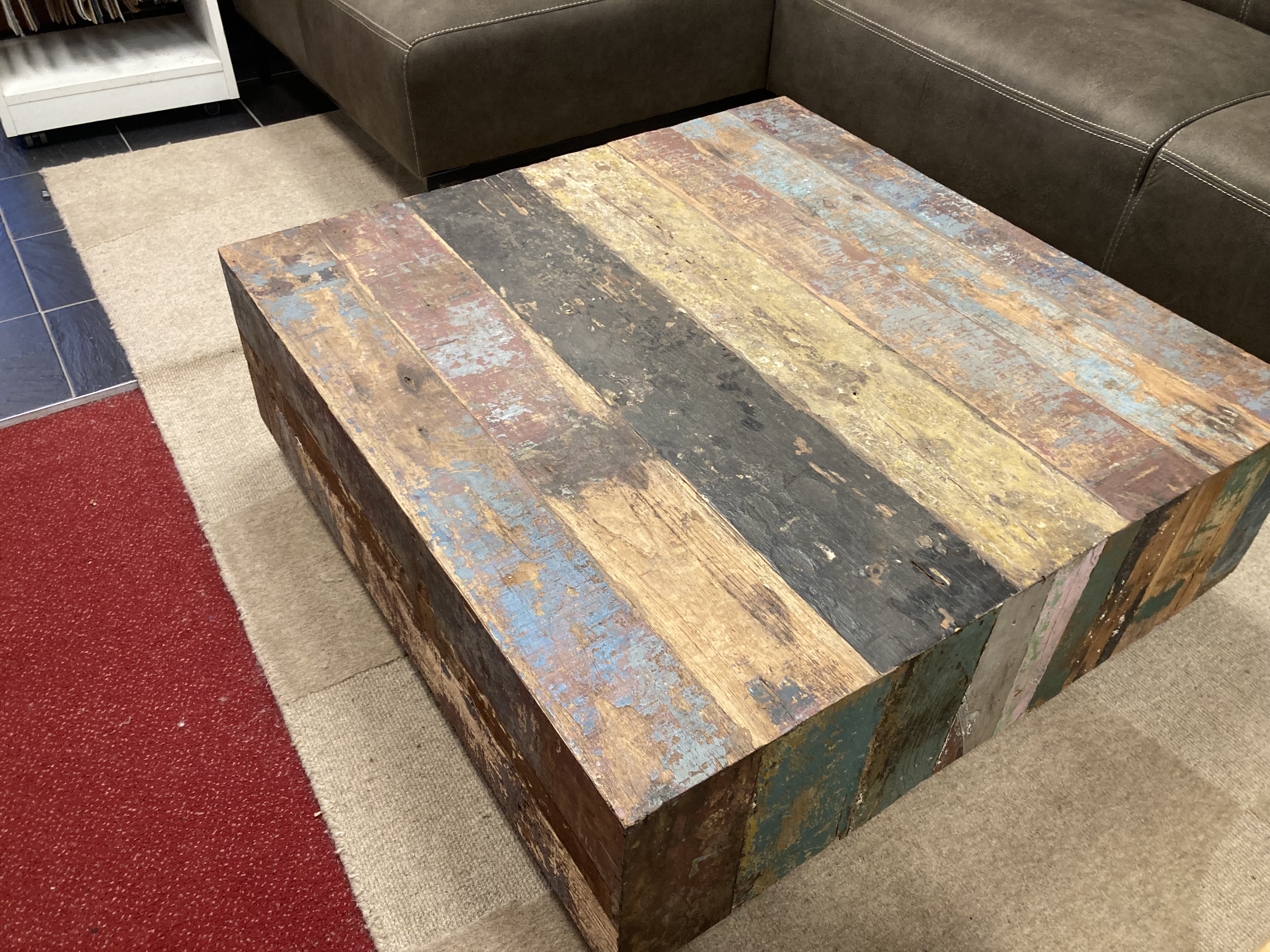 Mooie unieke bloksalontafel van orgineel hout wat afkomstig is van oude vissersboten uit Indonesië. Afmeting 100 cm/100cm/40cm.