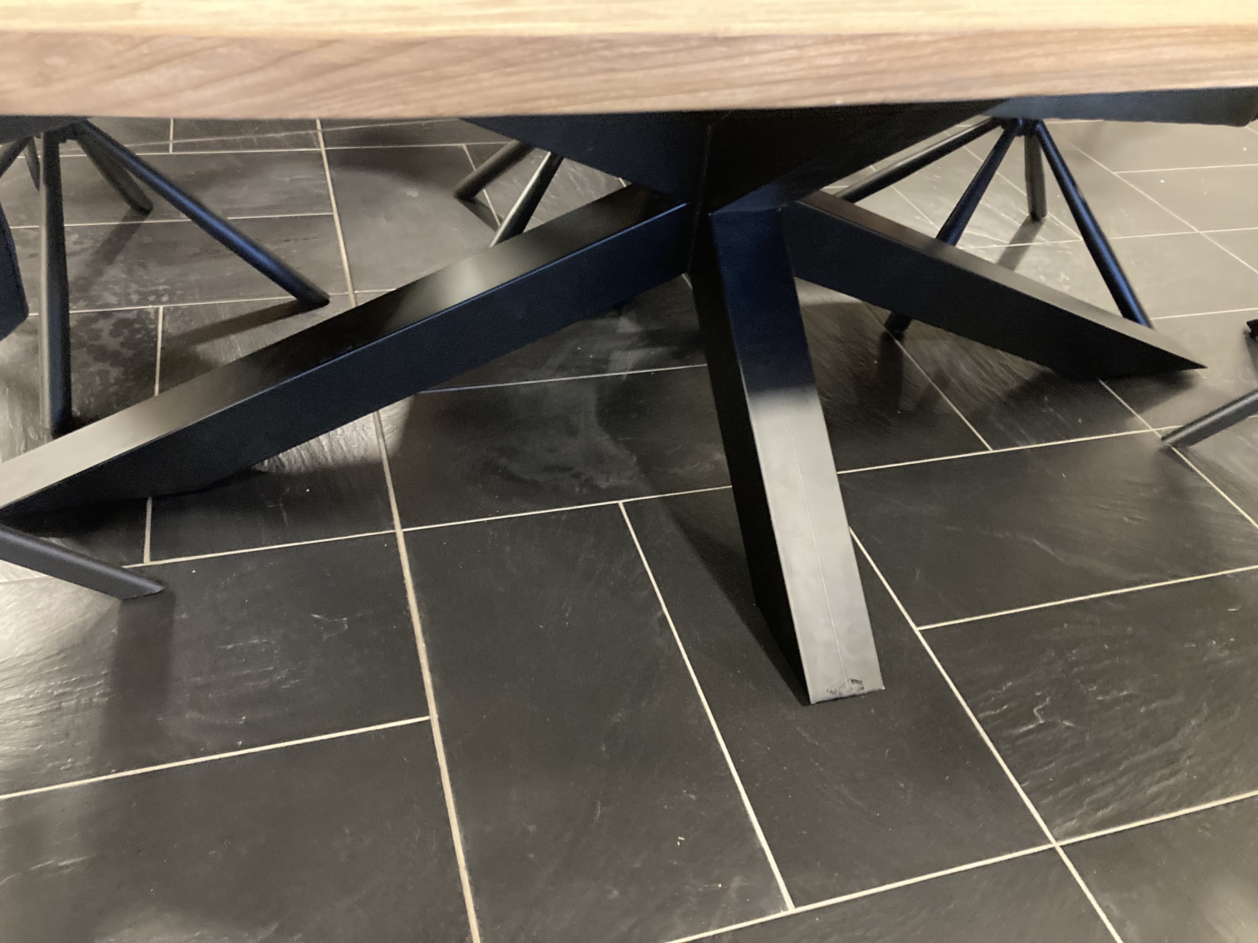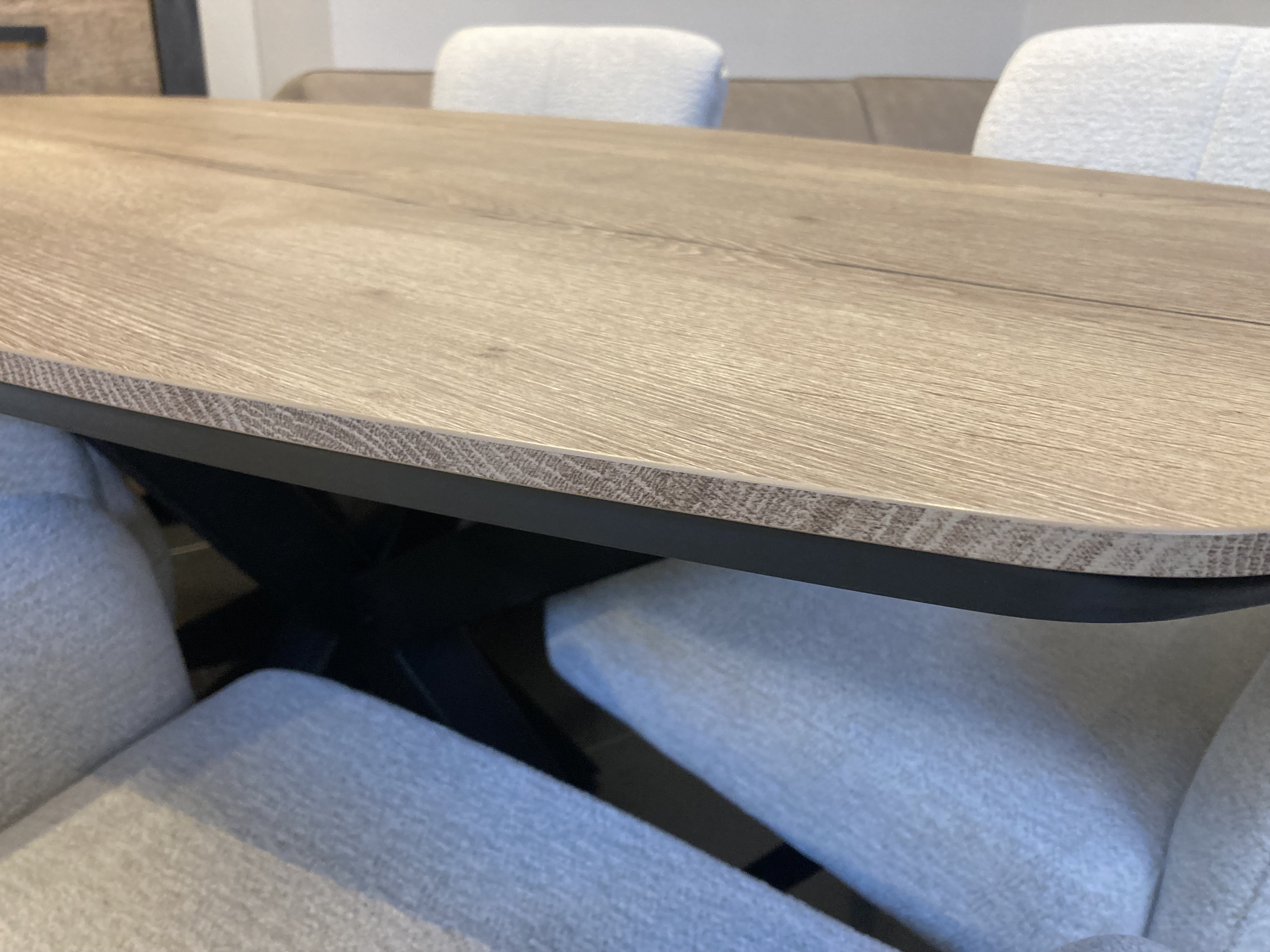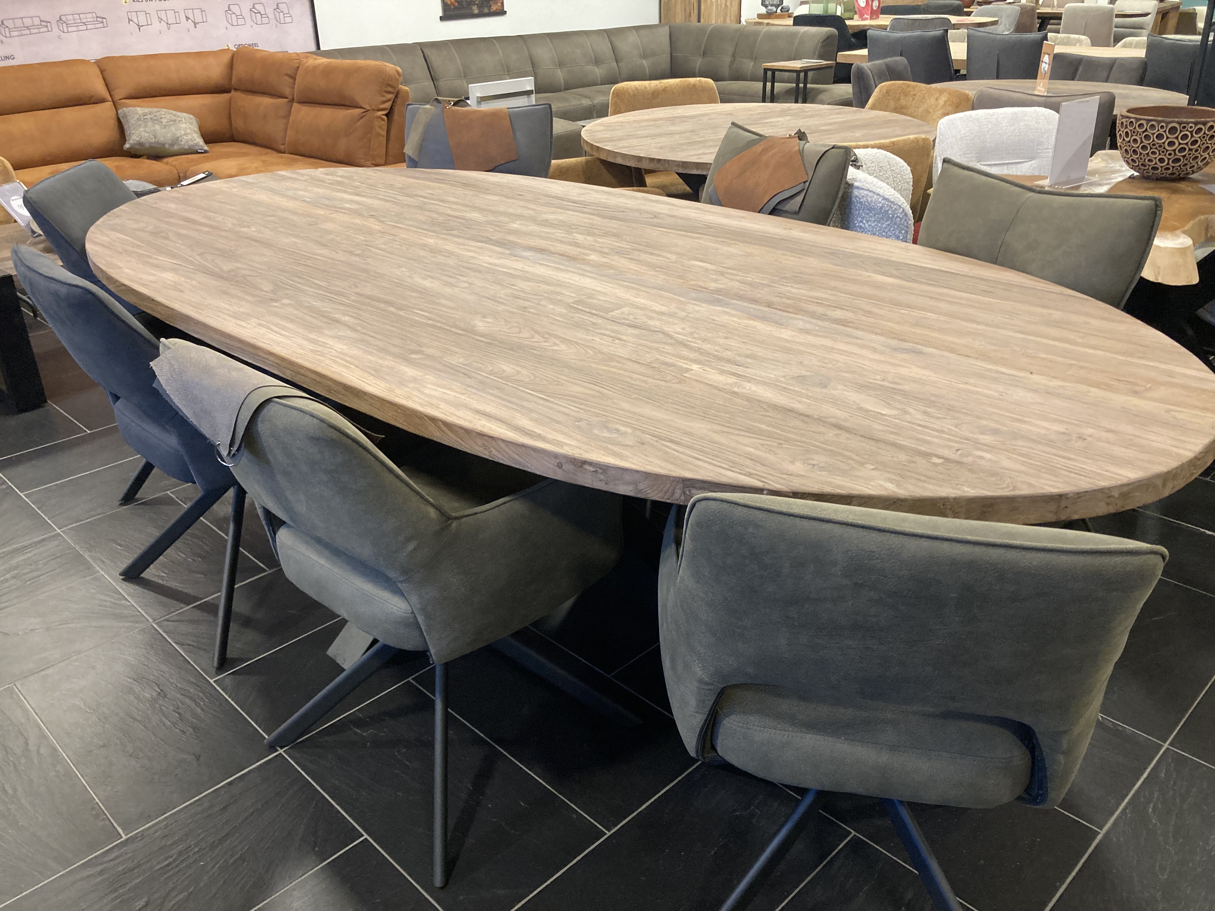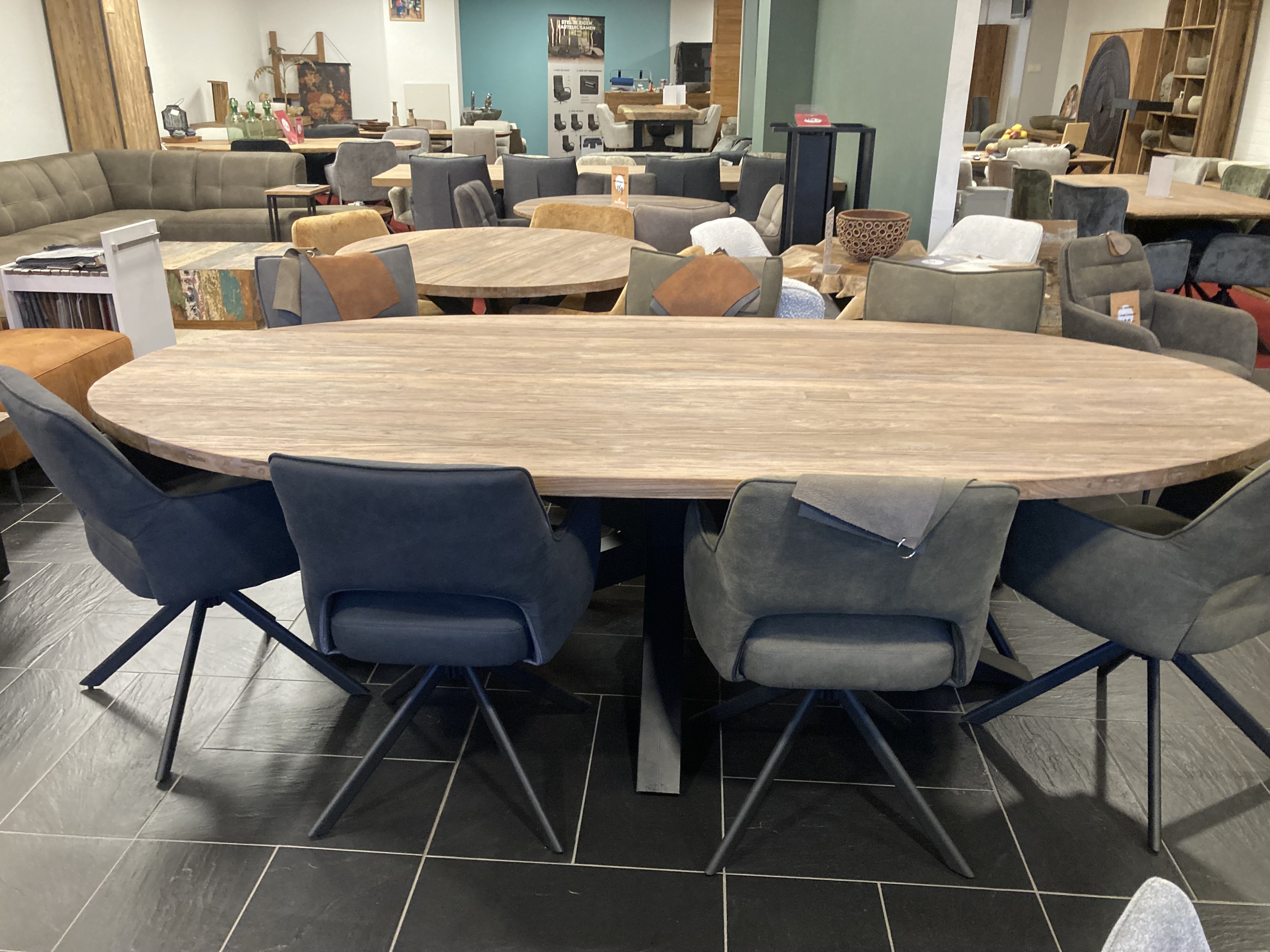 Deze mooie ovale tafel is gemaakt van oud gerecycled teakhout en heeft een bladdikte van 4 cm. Met matrixpoot matzwart. Tafel is behandeld tegen kringen met een ultra matte laag.