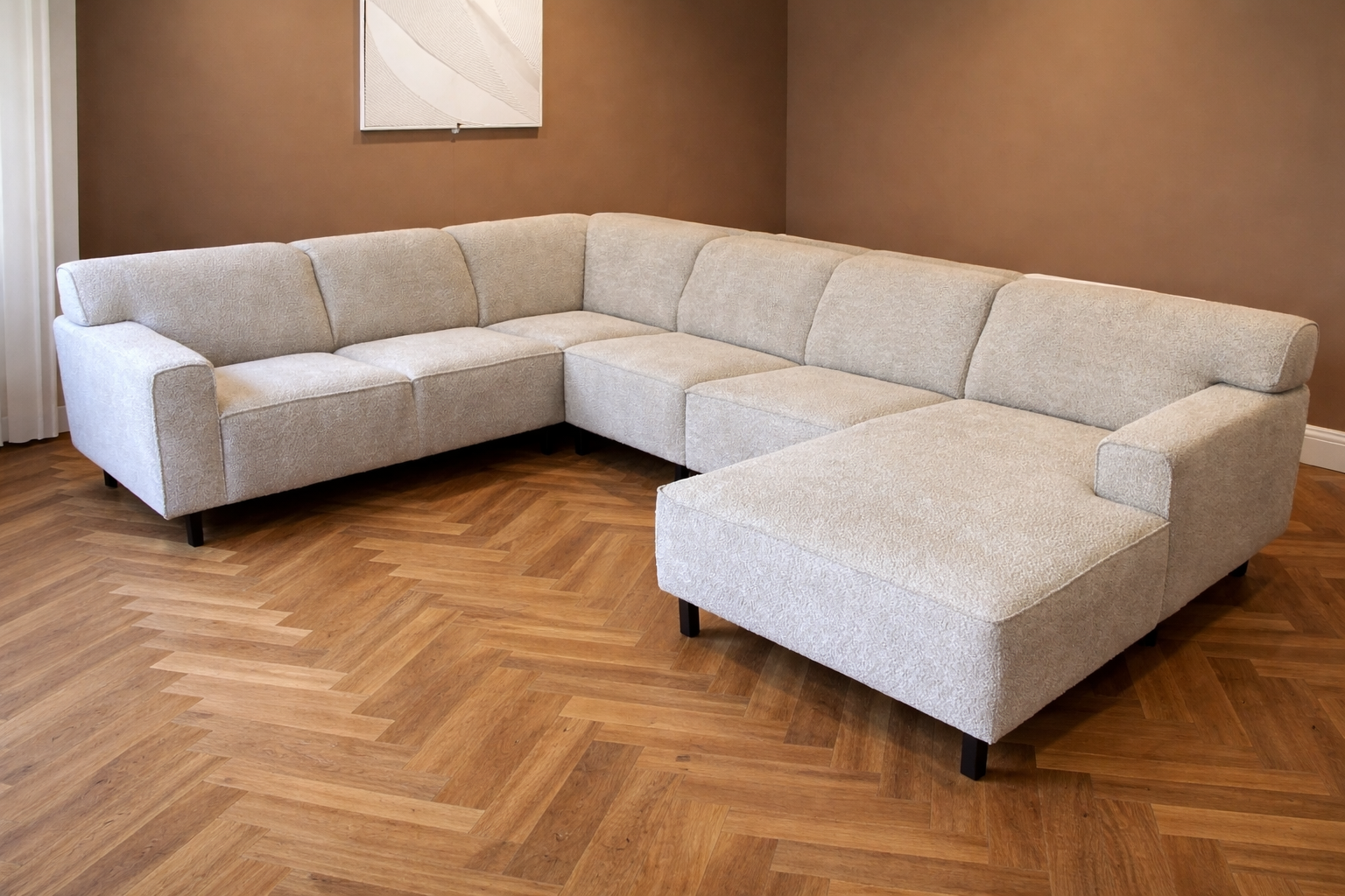 De prachtige bank OLLE heeft vele mogelijkheden in afmeting, vorm, stoffen. Het is voorzien van een medium harde koudschuim vulling. Model van de foto heeft een boucle stof. Vaste zit en rug .